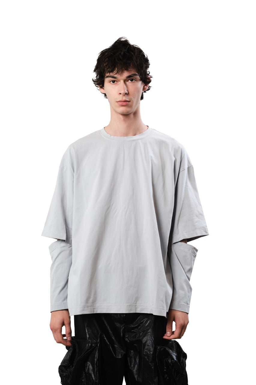 Boxy-fit long sleeve tee with elbow slits, crafted from mid-weight cotton jersey. Features a clean front with subtle dual-label detailing near the hem. The back is printed with a distressed rectangular graphic, evoking worn surfaces and decayed textures. Garment-dyed for a washed, lived-in finish that enhances the abstract print. A minimal essential with quiet depth — designed to layer or stand alone.