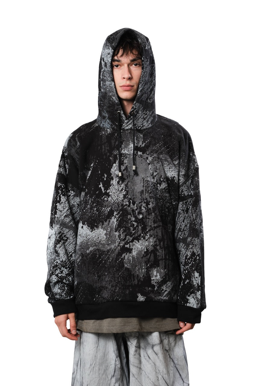 Oversized hoodie featuring an expressive all-over monochrome print reminiscent of textured stone and weathered surfaces. Designed for comfort and visual impact, it includes a spacious front pocket and subtle double fake vents on the back. The adjustable hood comes with cord straps tipped in matte metal trims. The unique print design was created by Balazs Milanik and screenprinted by Biquet Studio, ensuring each piece carries a bold yet refined identity.