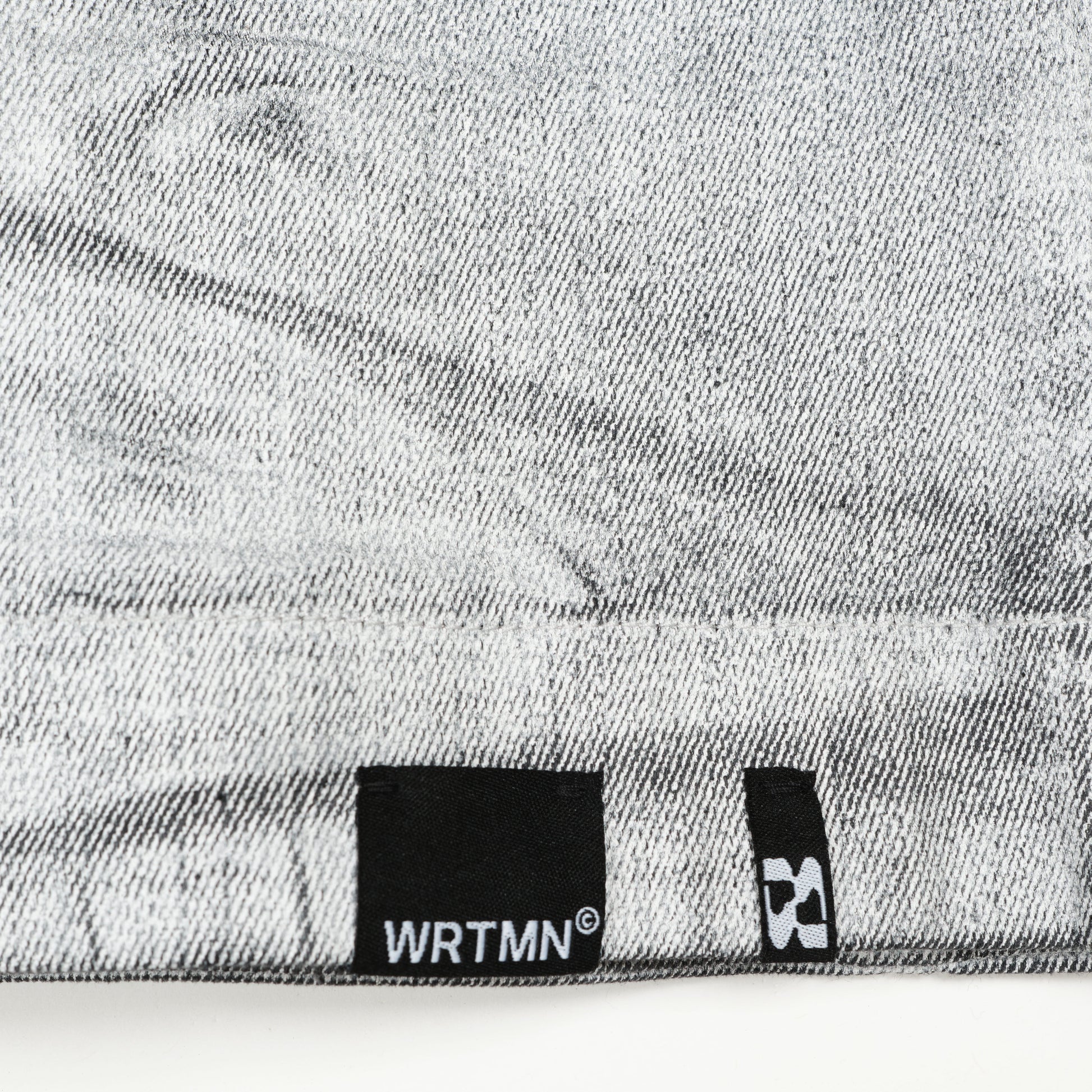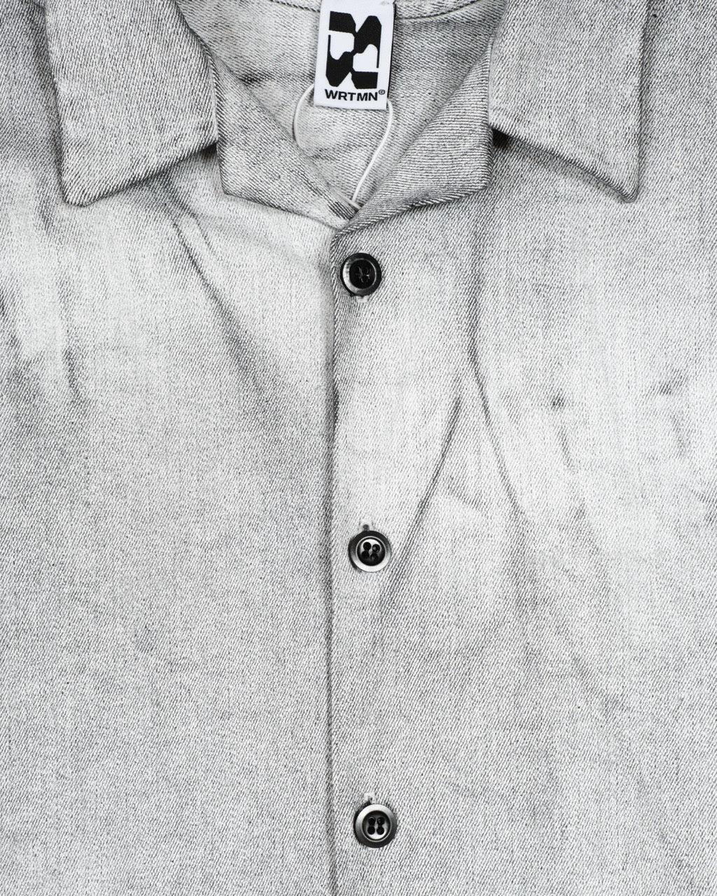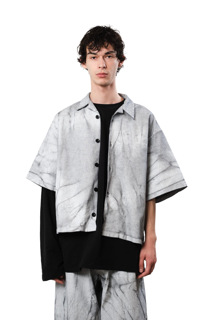 Short-sleeve button-up shirt with a sharp boxy cut, crafted from coated denim and washed for a marbled, stone-like finish. Designed with dropped shoulders and a structured drape for a relaxed yet refined silhouette. Minimal detailing keeps the focus on the fabric’s unique texture. A versatile layering piece that adds a sculptural, modern edge to any look.